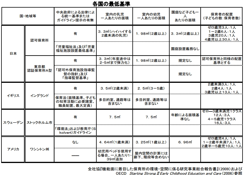規制緩和論という視点を持つ限り、子どもを安心して預けらる保育園はできないのではないでしょうか。ご参考までに各国の最低基準(保育士や面積)の比較表を掲載します。下の図をクリックすると拡大されます。